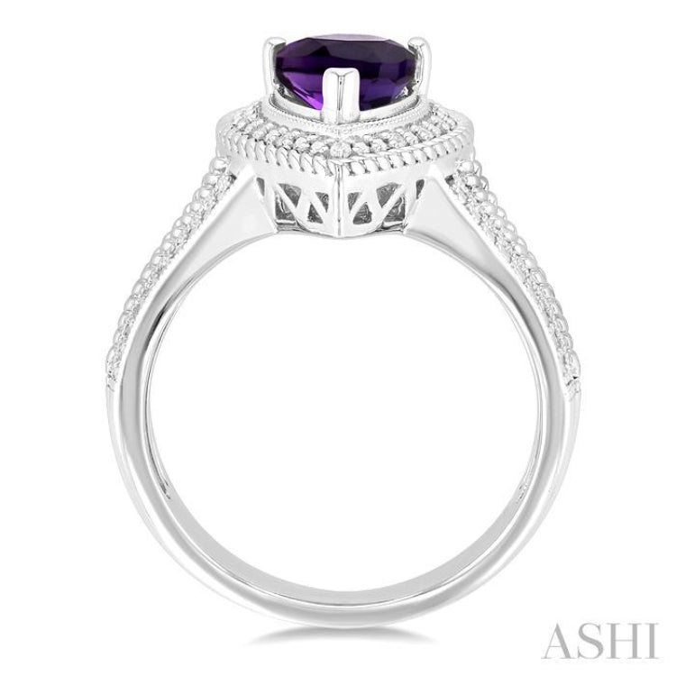 A stylish semi-precious Amethyst and diamond ring, this makes a great addition to any woman's jewelry collection. It is attractively styled, with a pear shape mount that features a 9X6MM pear cut Amethyst center stone, raised on prongs. 12 pave set round cut diamonds form a halo around the center stone, while a rope carving lines the edges of the center mount. The inner split of the cathedral shank is also lined by the rope carving. A milgrain finish is seen around the center stone and on the shank. The semi-precious Amethyst and diamond ring is crafted in a rhodium finish silver. Total diamond weight is 1/20 ctw.