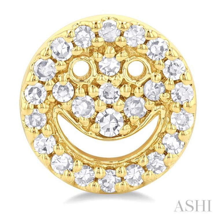 A smiley face is a symbol of positivity, optimism, happiness and peace. The smiley face has been around for over half a century and has had different connotations, but the basic representation has always been positive. The symbol has been used in various products including jewelry, which has found many takers for it through the years. This lovely pair of diamond smiley fAshion stud earrings from the petite collection is a must-have. It is embellished with 50 prong set round cut diamonds, 25 each on the earring pair. The Petite smiley fAshion earring is styled in 10 karat yellow gold. Total diamond weight is 1/6 ctw.