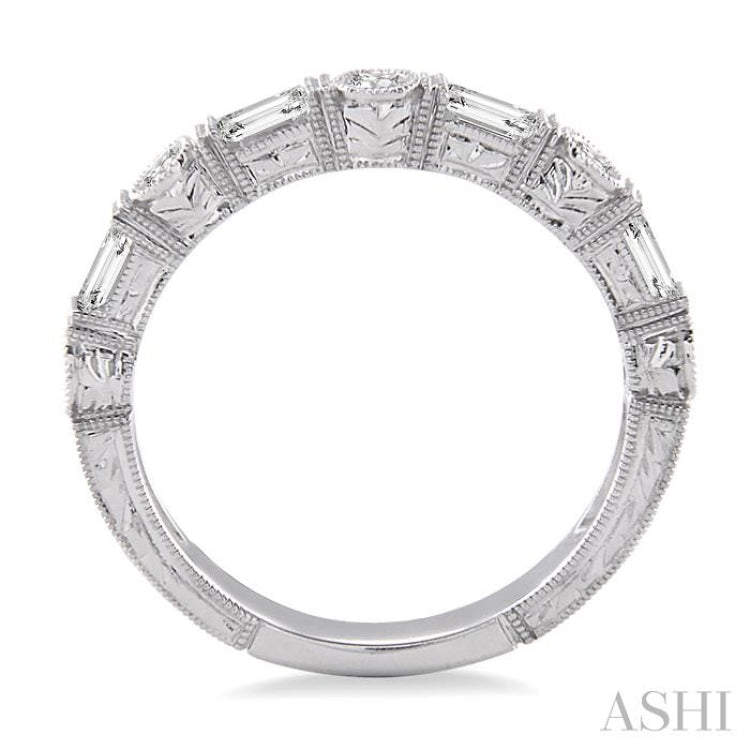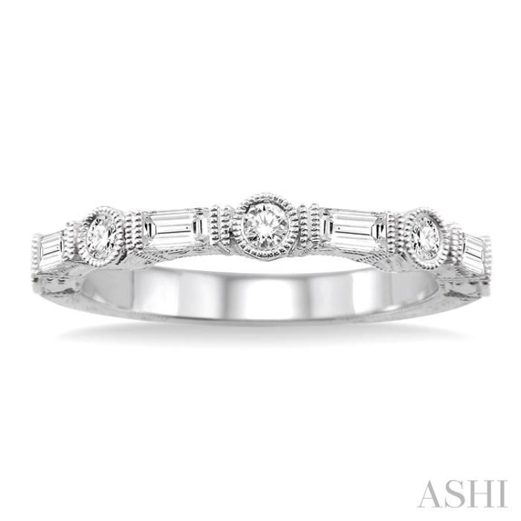 Add a touch of style to her look with this beautiful diamond fAshion band. FAshioned in gleaming 14 karat white gold with milgrain finish this band showcases a brilliant row of 9 sparkling round and baguette cut diamonds, perfectly set in bezel and channel settings. Total diamond weight is 1/2 ctw.