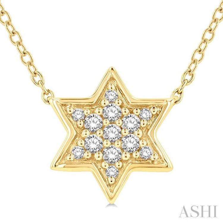 The Star of David, a 6-point figure, holds great importance for the Jews. It finds relevance and meaning, as it is believed to provide God's protection. Whether it is your faith that you wish to proudly display or a fashion statement that you want to make, this Star of David Petite diamond fashion pendant makes for a fine selection. It features a solid star shape and is adorned with round cut diamonds. There are a total of 13 pave set round cut diamonds embellishing the star pendant, which attaches to a Cat chain. Both pendant and chain are framed in 10 karat yellow gold. Total diamond weight is 1/10 ctw.