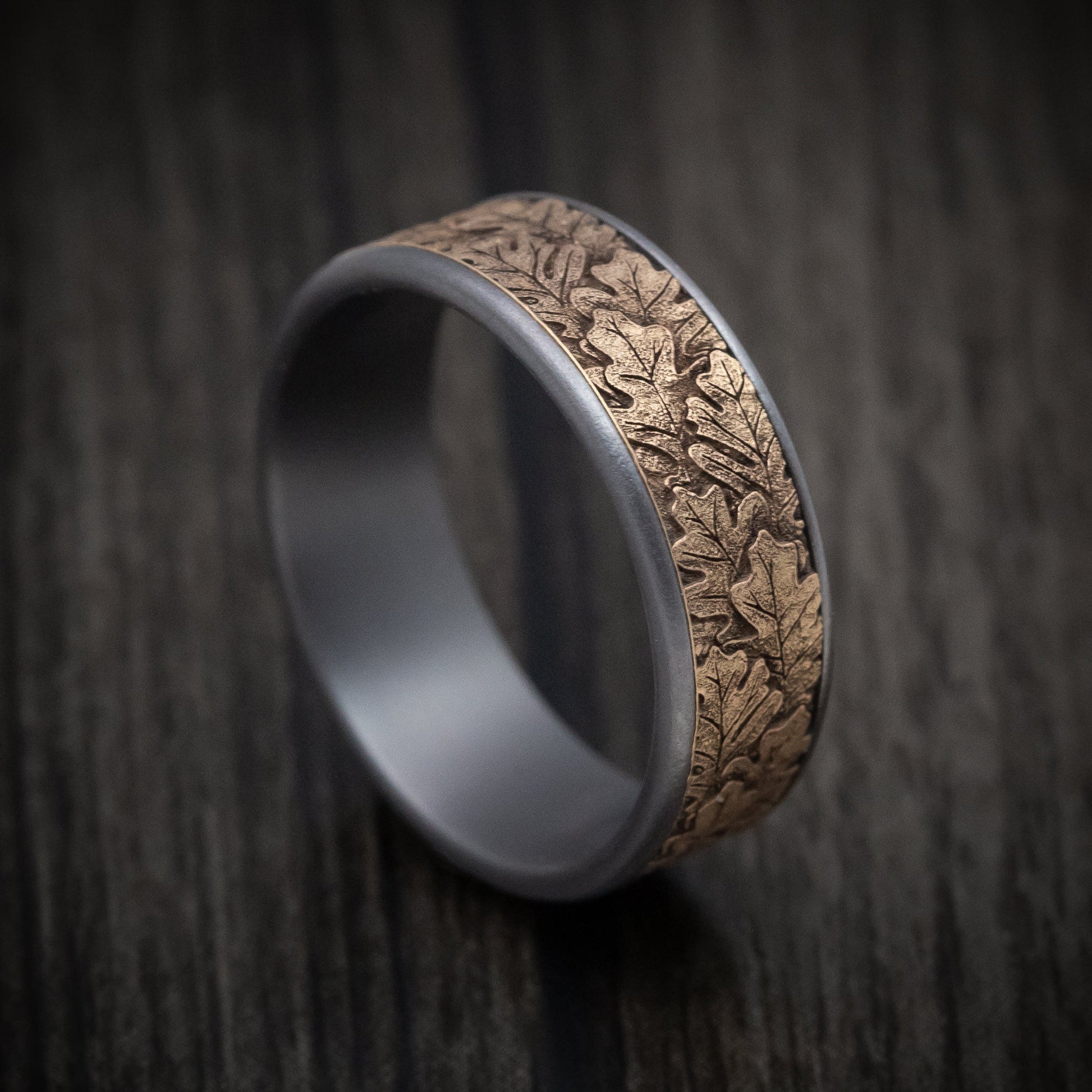 Elegantly crafted, this Tantalum ring from the Brook & Branch Collection features a 7.5mm width, flat shape, and satin finish. The 14K gold inlay with an oak leaf pattern adds a touch of sophistication. A timeless piece with a Benchmark logo on the interior.