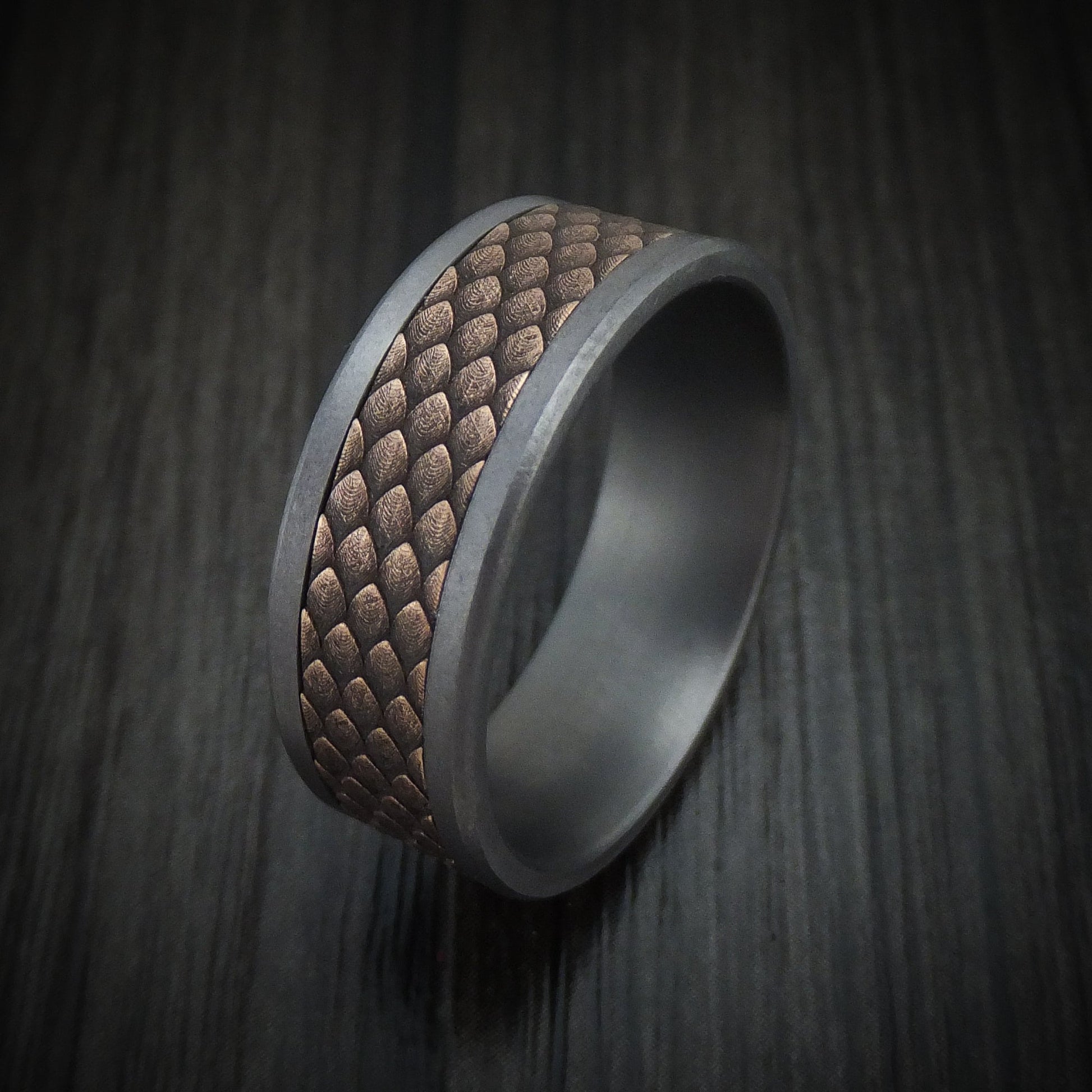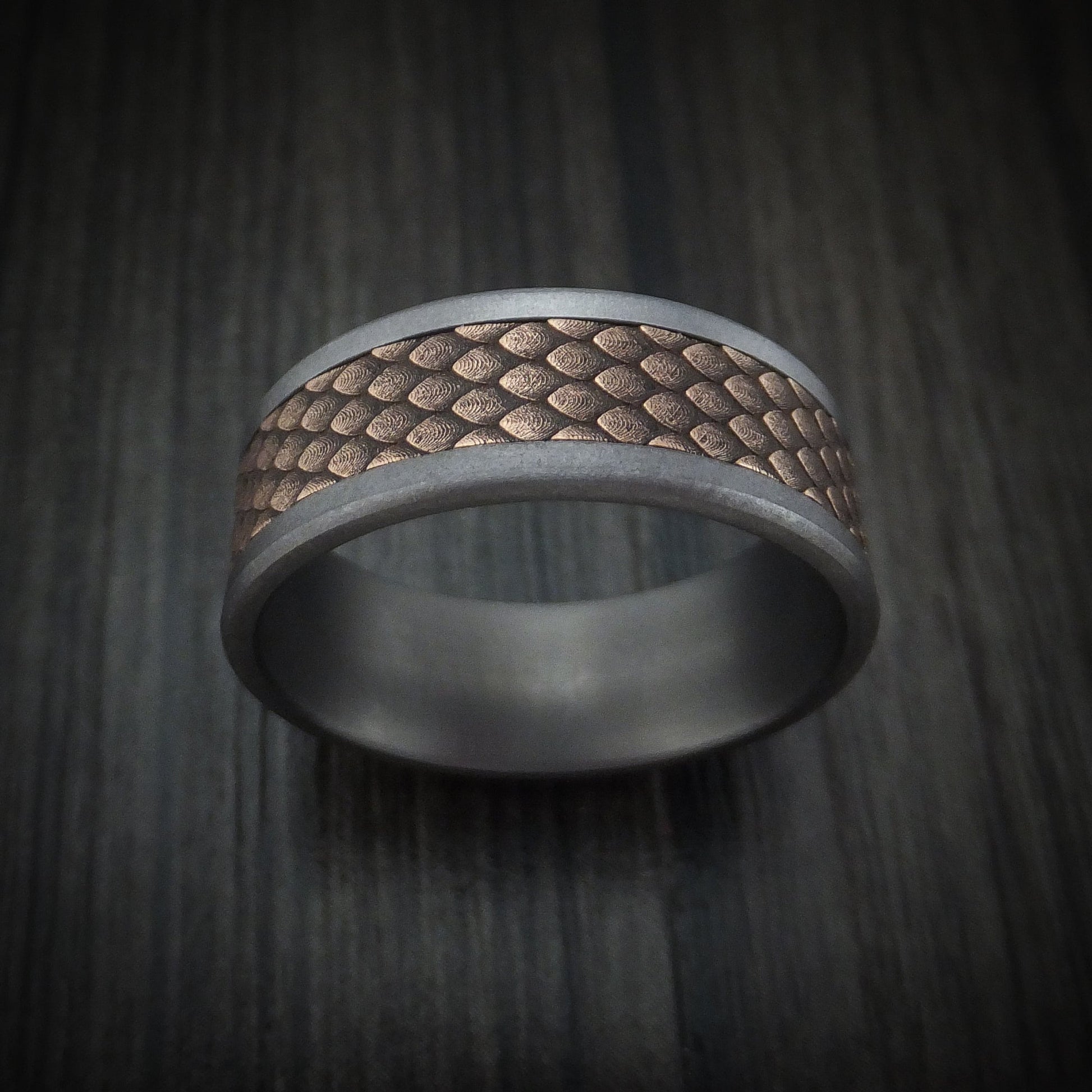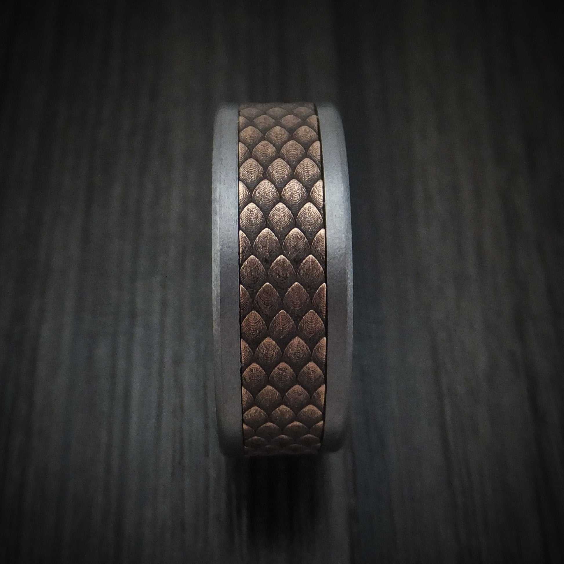 Experience the perfect blend of classic and cutting-edge with our Tantalum ring featuring a 14K Rose Gold Dragon Scale Textured Inlay. Crafted with the purest form of metal, this hypo-allergenic and durable ring is a true symbol of sophistication.