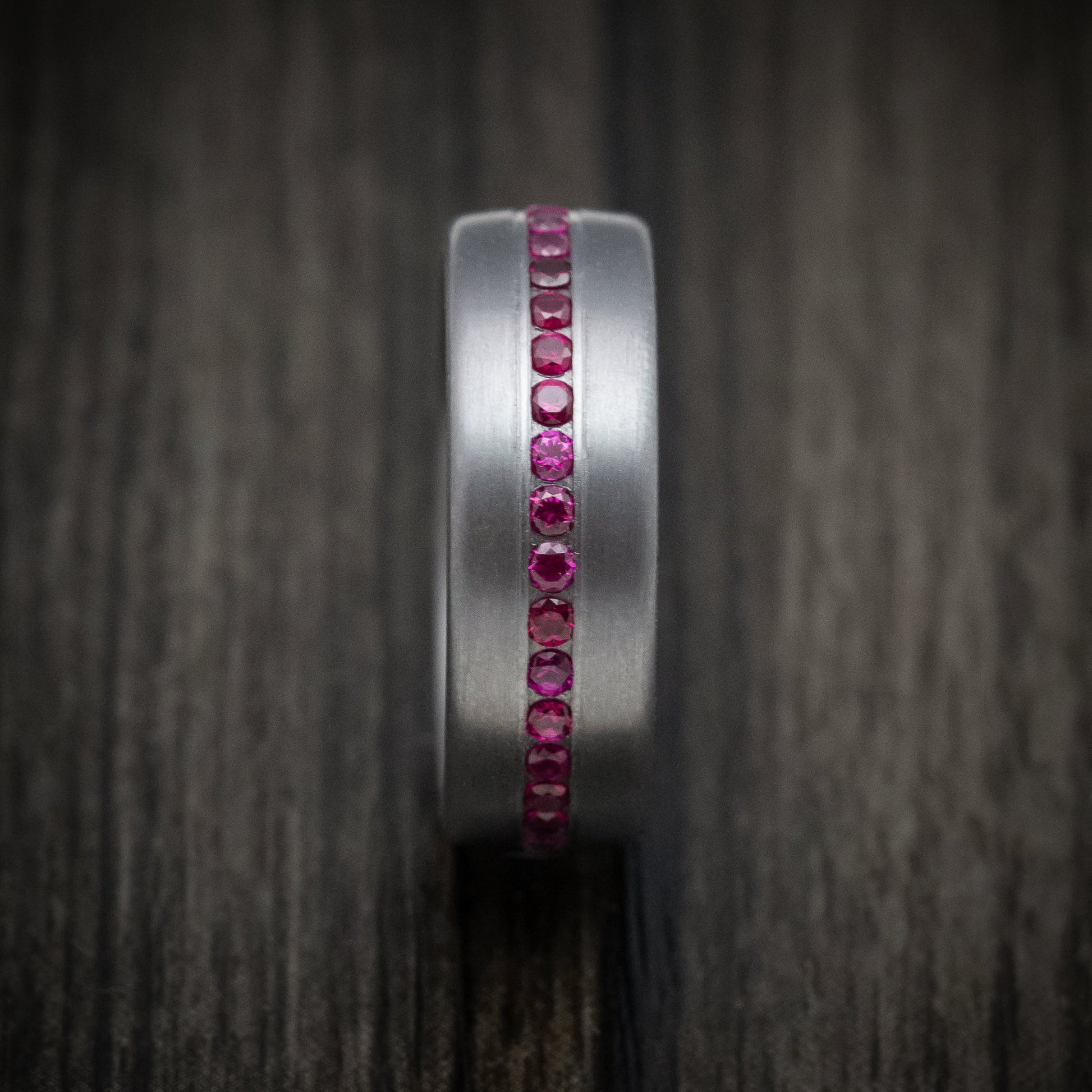 Elegantly crafted with a 7.5mm width and domed shape, this Tantalum ring features a satin finish and 20 channel-set rubies. Custom-made to your specifications, this contemporary metal ring from Benchmark Rings combines industrial ruggedness with gold workability for a truly precious piece.