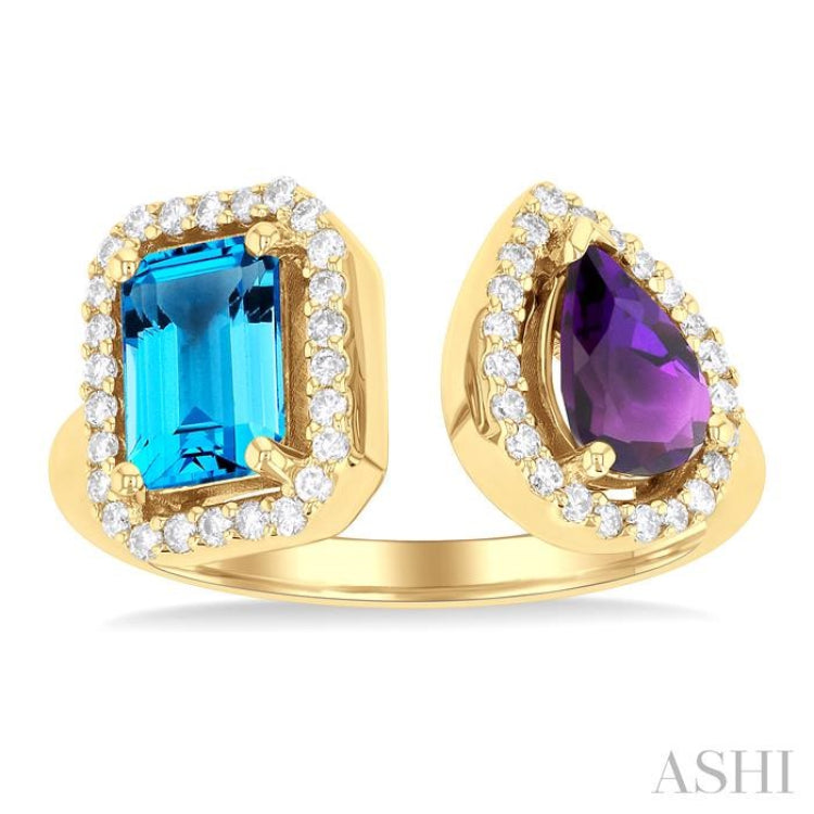 Toi Et Moi, which basically translates to 'you and me', in jewelry is defined by two stones, in the same or different cuts, lying side by side. The Toi Et Moi ring is a symbol of love, and so is this semi-precious open fAshion ring here. It features an open enter, with an octagonal shape mount on one end and a pear shape mount on the other. Embellishing the octagonal mount is a 7X5 MM emerald cut blue topaz center stone, haloed by 26 prong set round cut diamonds. The pear shape mount is adorned with a 7X5 MM pear cut Amethyst center stone, bordered by 23 prong set round cut diamonds. The semi-precious fAshion ring is styled in 14 karat yellow gold. Total diamond weight is 1/5 ctw.