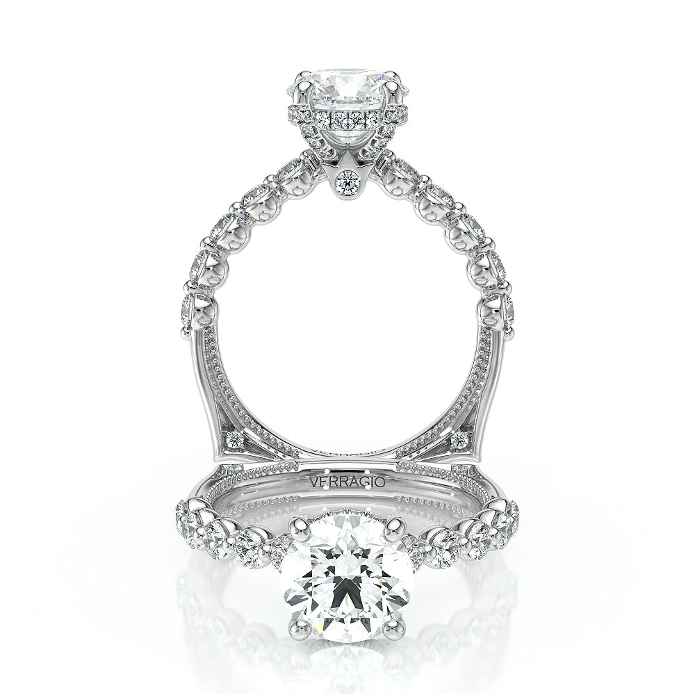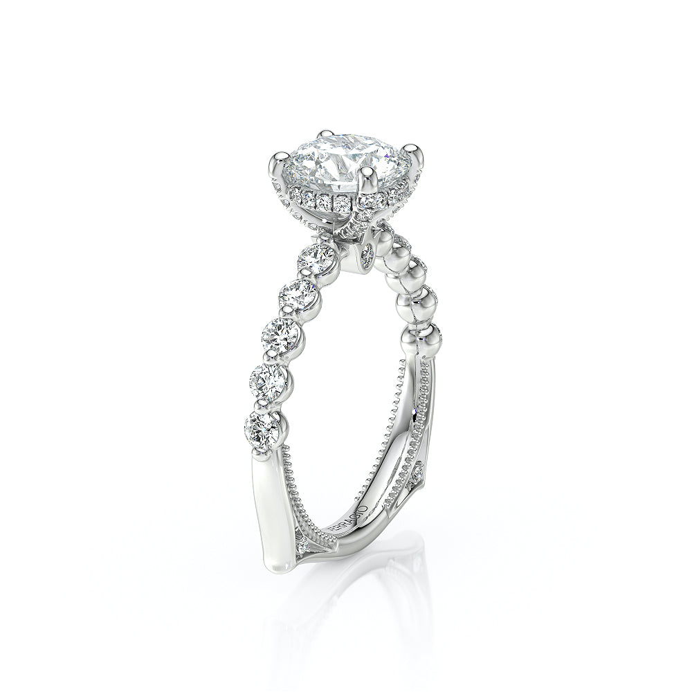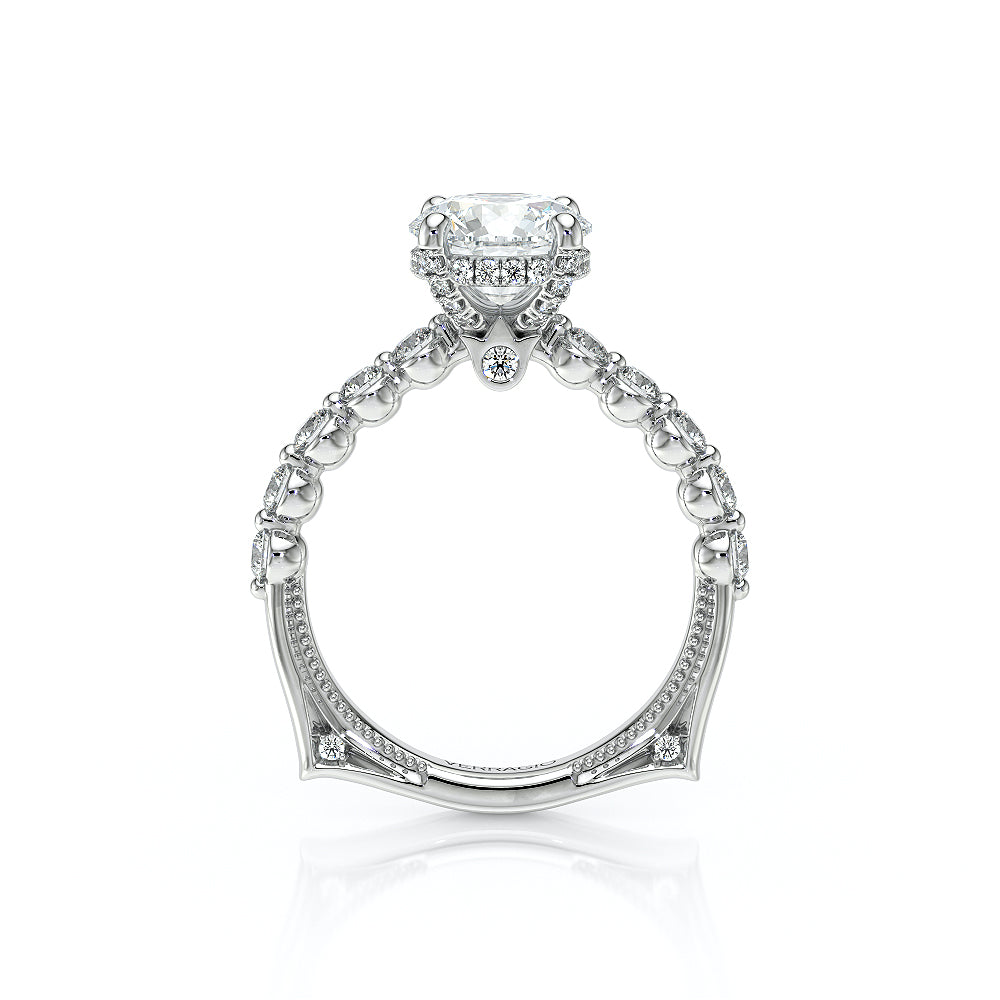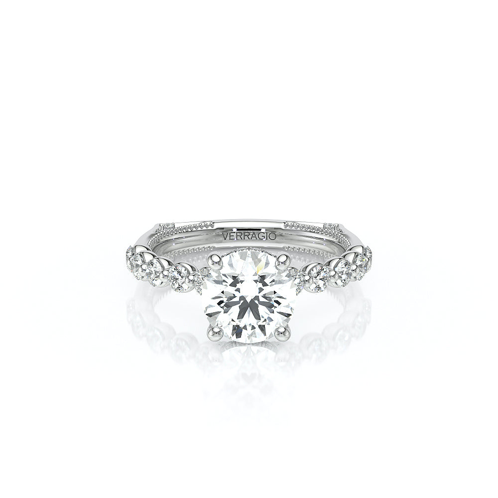 Set for a round center, the VNG-2201R-2.4 features a euro-style shank at the bottom of the ring, elevated by two tiny diamond bezels. 2.4mm stones gracefully adorn the shank, set with a single shared prong for a timeless and elegant design.
