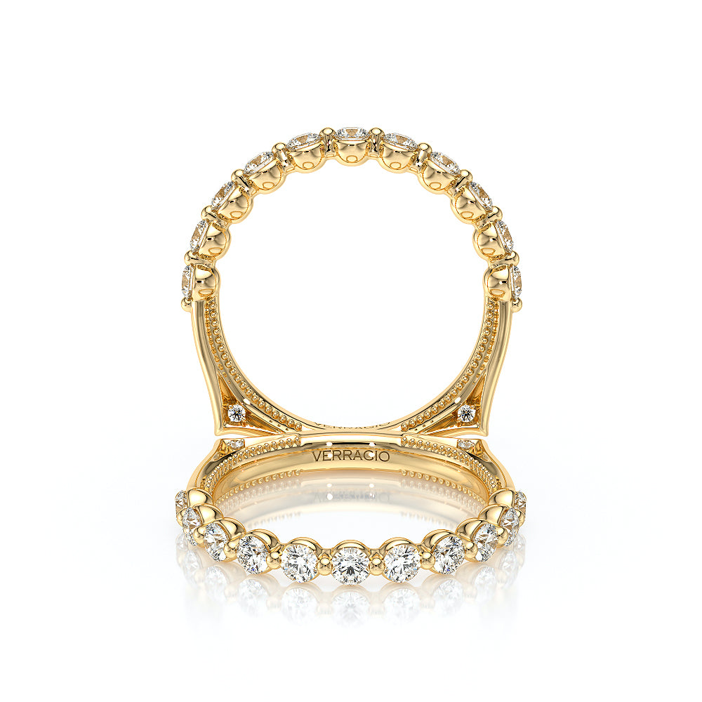 The VNG-2201W-2.4 wedding band features a euro-style shank elevated by two tiny diamond bezels. 2.4mm stones gracefully line the shank, set with a single shared prong, offering a seamless and elegant complement to its engagement ring counterpart.