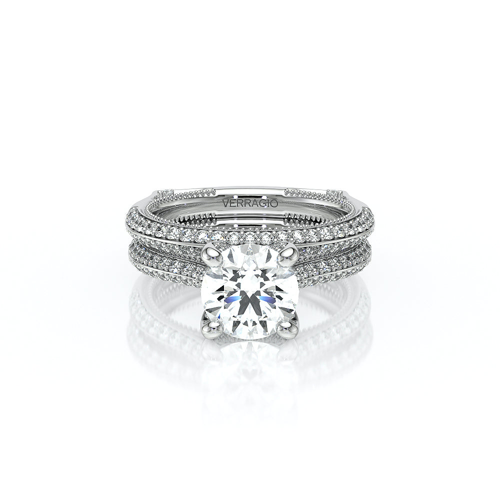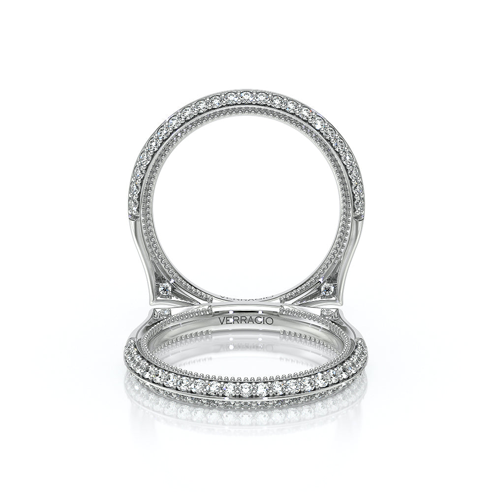The VNG-2204W wedding band features a knife-edge shank with round stones and Verragio beading on the side profile, creating a timeless and versatile design that shines on its own.