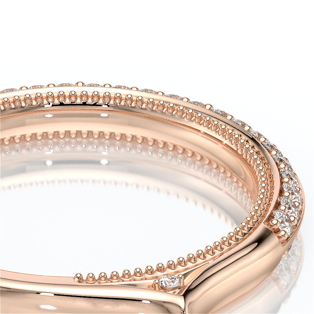 The VNG-2204W wedding band features a knife-edge shank with round stones and Verragio beading on the side profile, creating a timeless and versatile design that shines on its own.