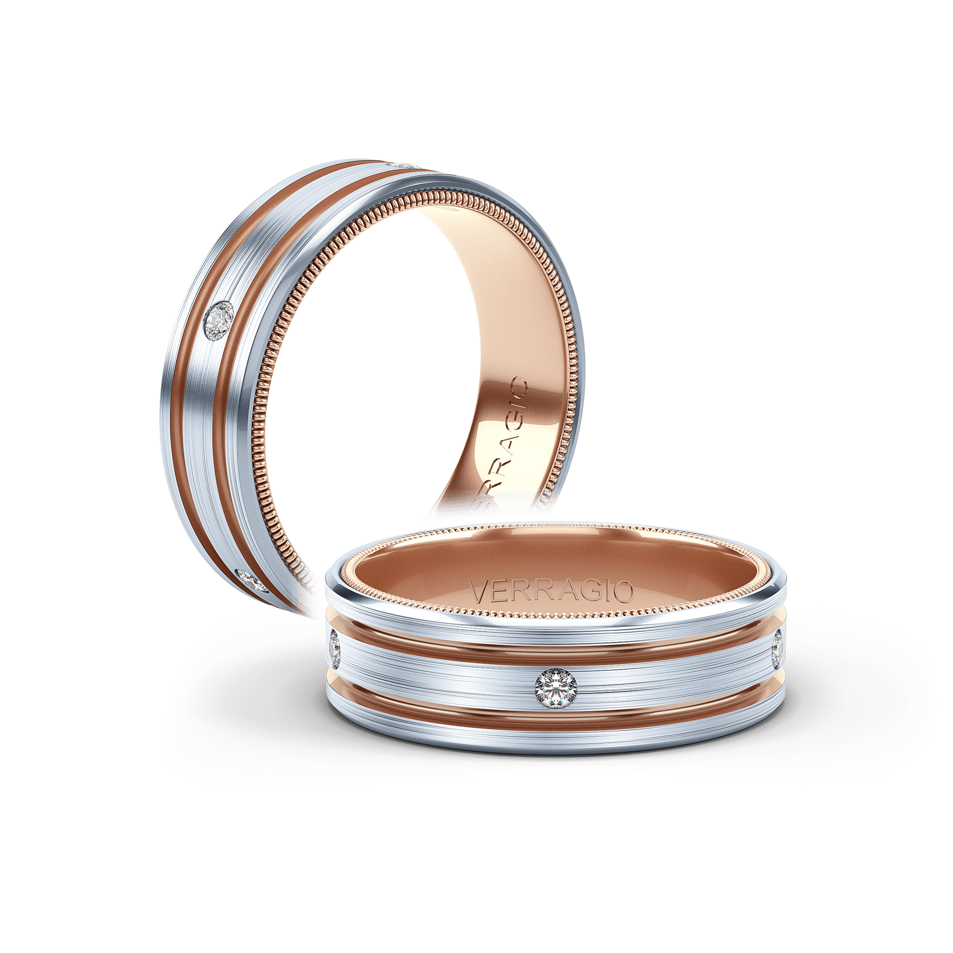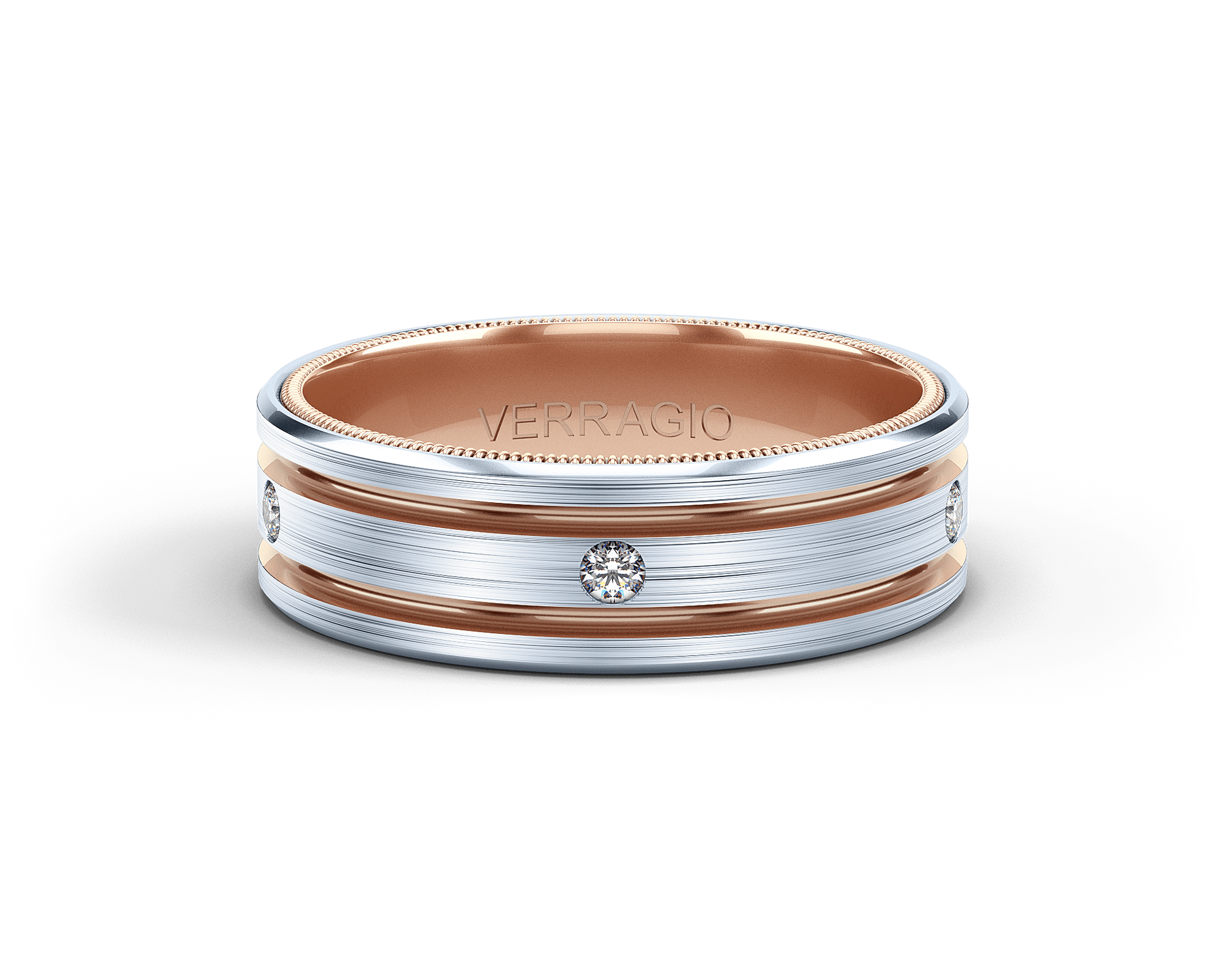 VWD-7914 is our stylish 7MM width diamond men's band with a matte finish. Along the heart of the band creating a contrast run two grooves etched in rose gold, accompanied by round brilliant cuts and enhanced by Verragio's signature beading.