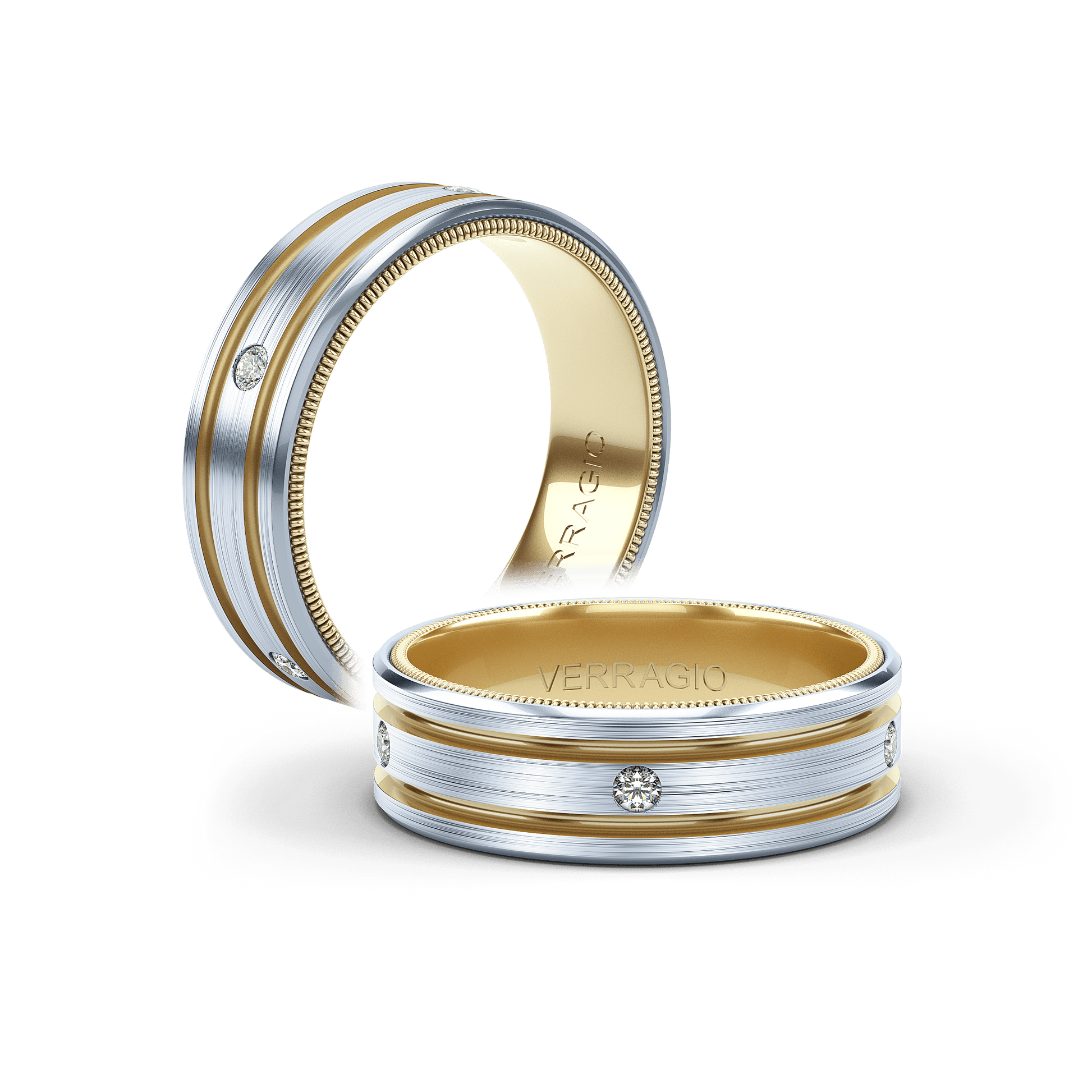 VWD-7914 is our stylish 7MM width diamond men's band with a matte finish. Along the heart of the band creating a contrast run two grooves etched in rose gold, accompanied by round brilliant cuts and enhanced by Verragio's signature beading.