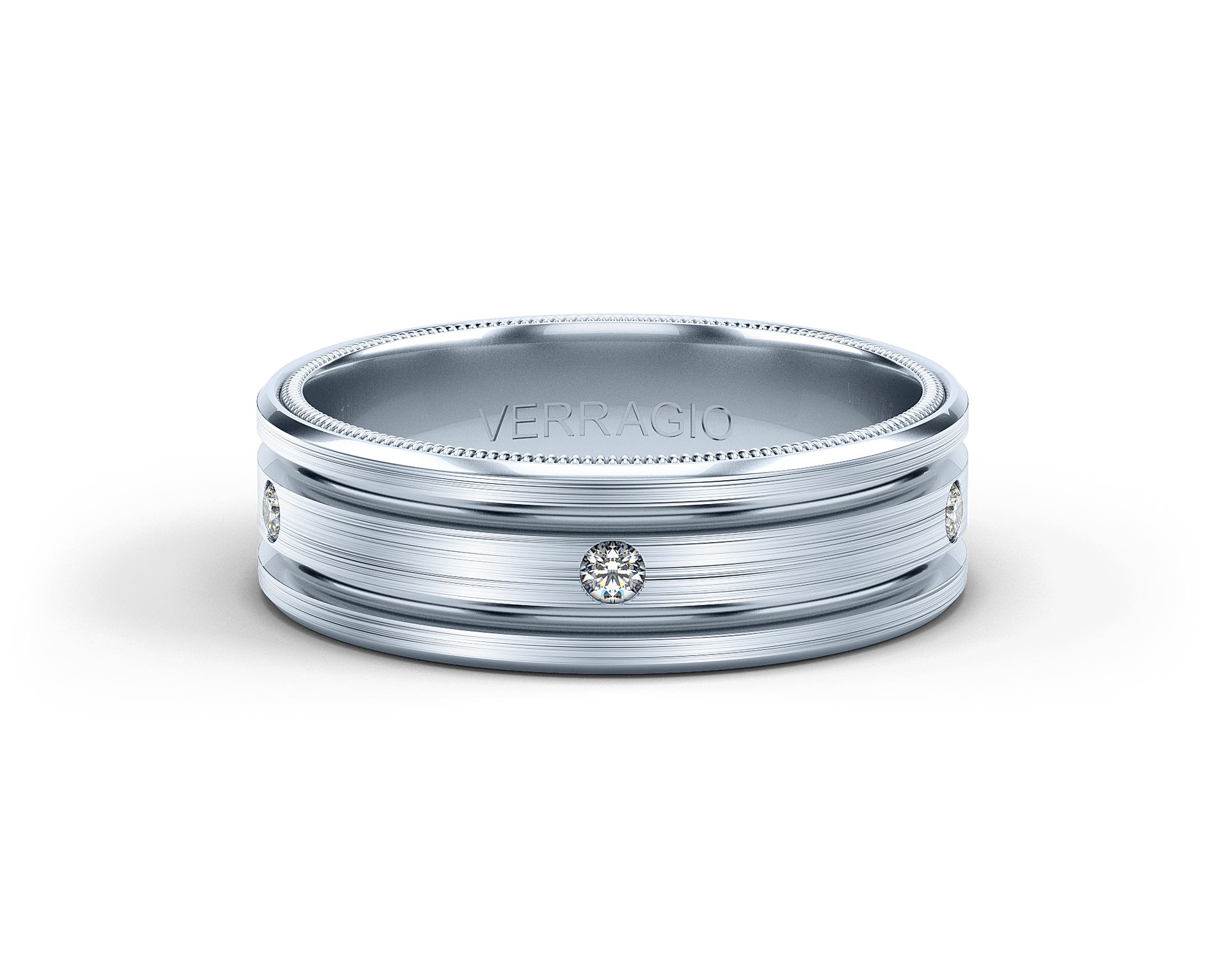 VWD-7914 is our stylish 7MM width diamond men's band with a matte finish. Along the heart of the band creating a contrast run two grooves etched in rose gold, accompanied by round brilliant cuts and enhanced by Verragio's signature beading.