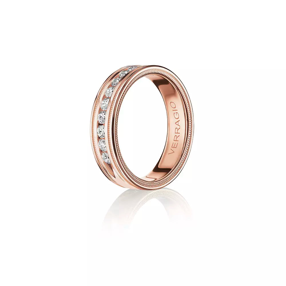 The VWRD-6701-2.5 features a 6mm band width with 2.50mm channel-set diamonds, framed by exquisite milgrain rows and intricate beading. This band combines timeless elegance with meticulous craftsmanship, making it an ideal choice for those who appreciate luxury and detailed design.